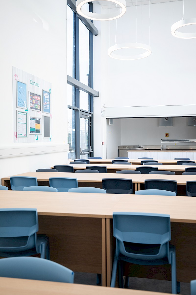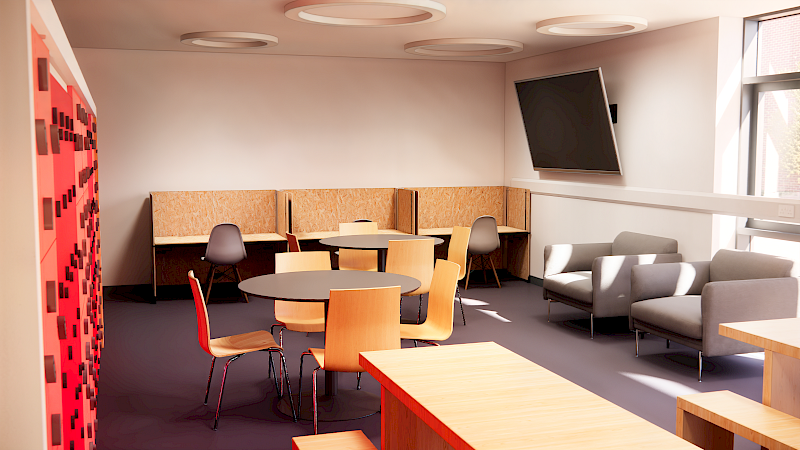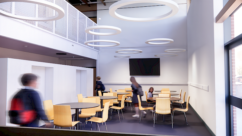 The design focuses on efficiency, accessibility, and inclusivity, ensuring the refurbished building supports both educational and wellbeing needs.