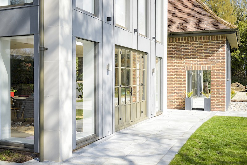The Solutions: Designed a stepped extension that gradually reduces from the existing structure, showcasing respect for the original home and aligned the eaves of the new elements to facilitate smooth transitions and an integrated feel. The stepped design also mimics the site's topography in the South-East corner. A carefully selected materials palette was chosen to harmonise with existing brickwork whilst also introducing complementary elements like stone surrounds and Crittall-style casements within a timber frame.